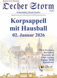 Traditionell übernimmt beim Korpsappell der Kommandant das Korps, um mit seiner Armee in den Kampf gegen Griesgram und Muckertum zu ziehen.Abmarsch mit musikalischer Begleitung ist ca. 19:45 Uhr am Elisenbrunnen, die Übergabe findet gegen 20:00 Uhr vor den Park-Terrassen statt.